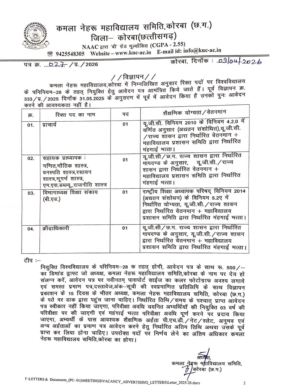 रिक्त पदों पर नियुक्ति हेतु आवेदन आमंत्रित 2026