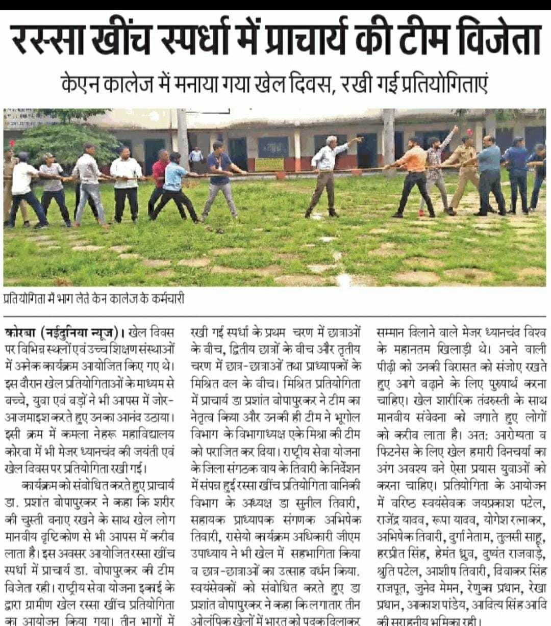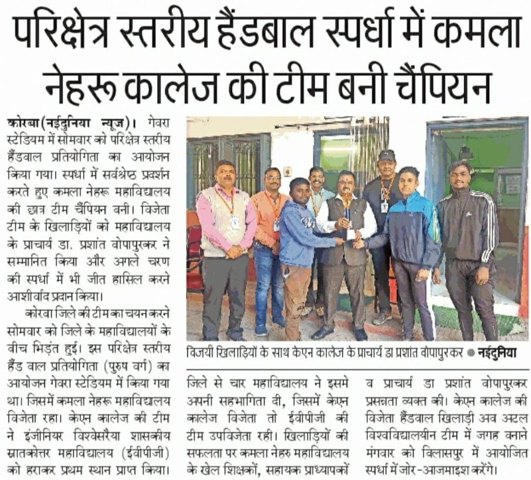 The basic aim of the Sports Department of Kamla Nehru College is to provide sports facilities to the students studying in the college as well as to those who are interested in sports activities. The department also aims at promoting the traditional games played in this region as well as introducing other national and international games. Within the college campus the department has prepared Basket Ball ground, Kho-Kho, Kabbadi and Malkambh ground. The department has it’s own Table-Tennis table kept in sports room for regular practice. For other sports,the sports department has membership with other sporting clubs like C.S.E.B, N.T.P.C. Nagar-Nigam Korba and S.E.C.L. Every year during prize distribution ceremony the outstanding performers in the field of sports are given prize and incentives like Track- Suit, Wind -Cheater, Trophies and Certificates. Time to time the department of sports arranges a coaching campus for various games to improve the sportive skills in students. It is noteworthy that the students have represented the state, national & all India level tournament. The department makes efforts for the maximum participation of the students in sports activities. Throughout the year, the students practice different games and avail the opportunity provided by the government and the university. It is worthwhile to mention that the participation of girls in sports activities is good. Different girl events are organized for their maximum participation.